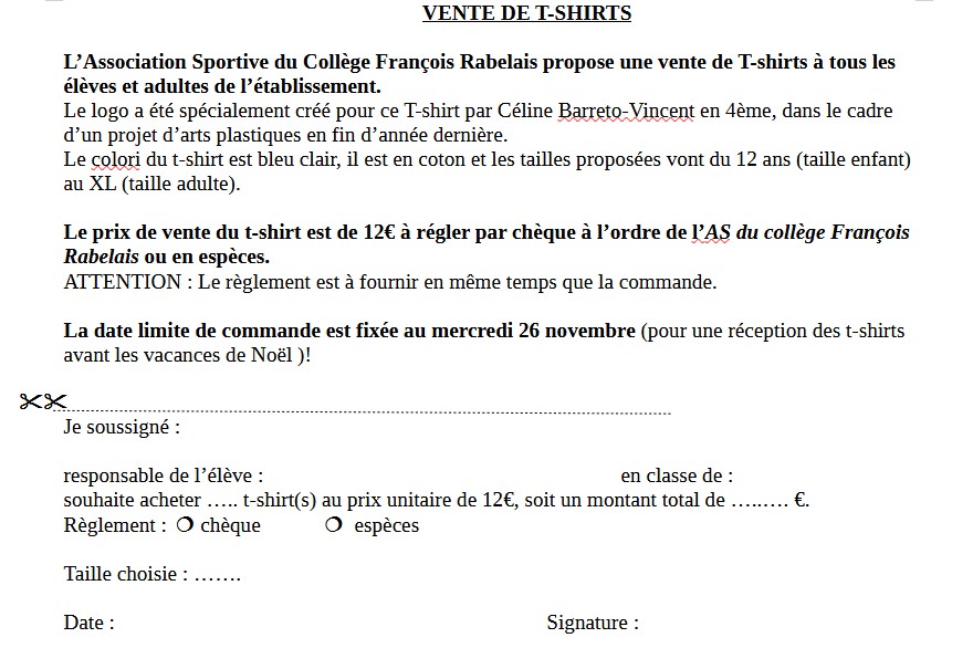 Le prix de vente du t-shirt est de 12€ à régler par chèque à l’ordre de l’AS du collège François Rabelais ou en espèces.